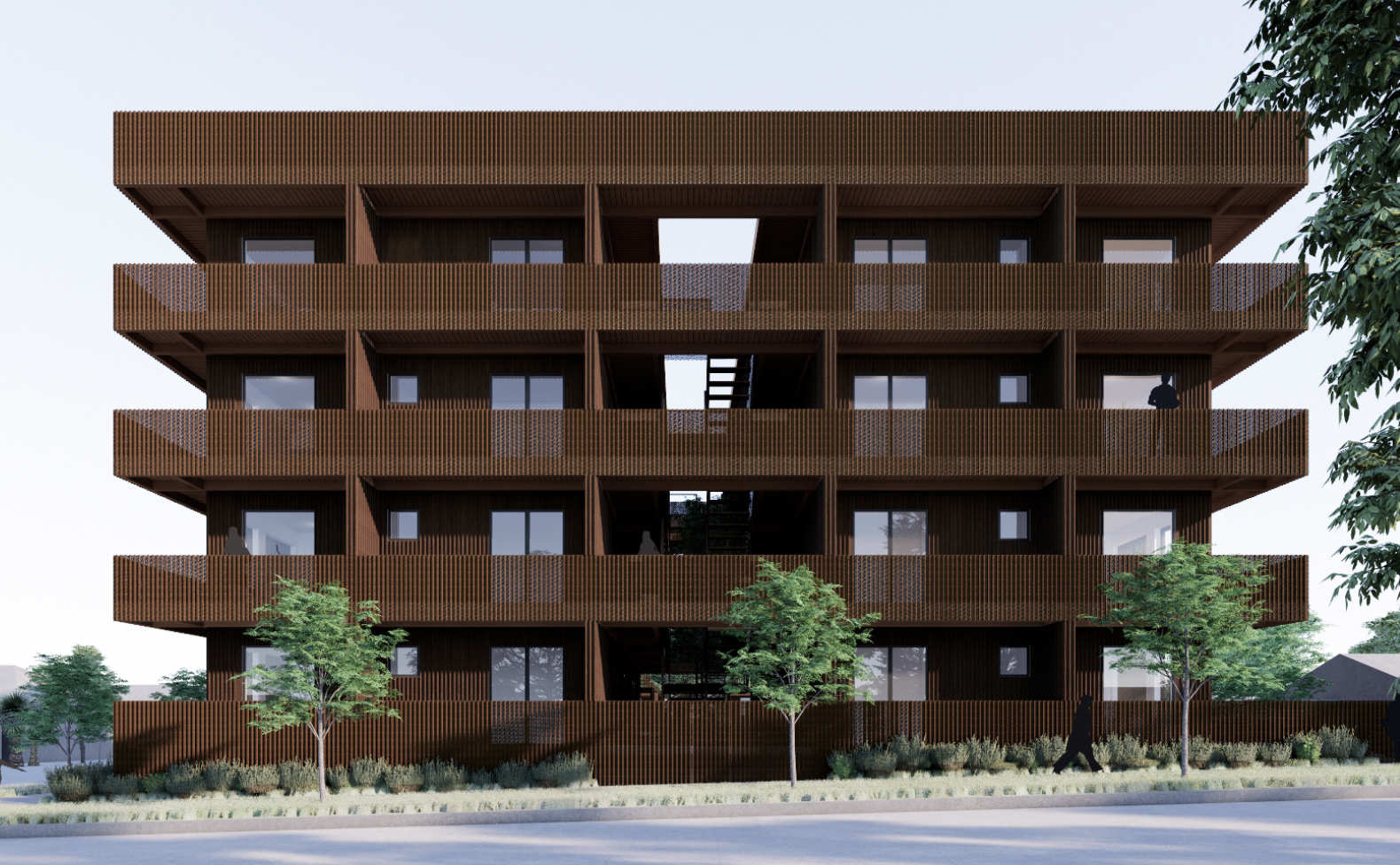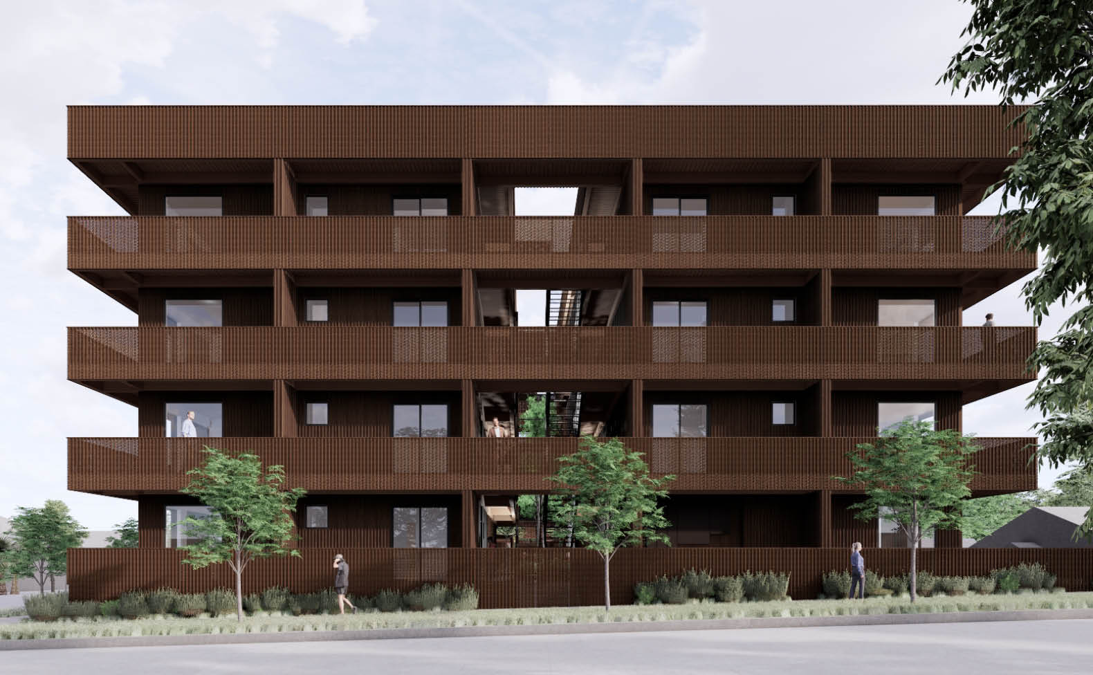 Two four-story housing blocks frame a shared courtyard opening out onto the North Lombard thoroughfare. The buildings’ character is given by continuous wrap-around balconies that create deep relief and articulation, while offering generous covered private outdoor space to residents. All vertical and horizontal circulation is around lushly planted courts open to the sky. Clad in perforated weathering steel, the buildings change in transparency throughout the day, allowing varied glimpses of the diverse life within.
